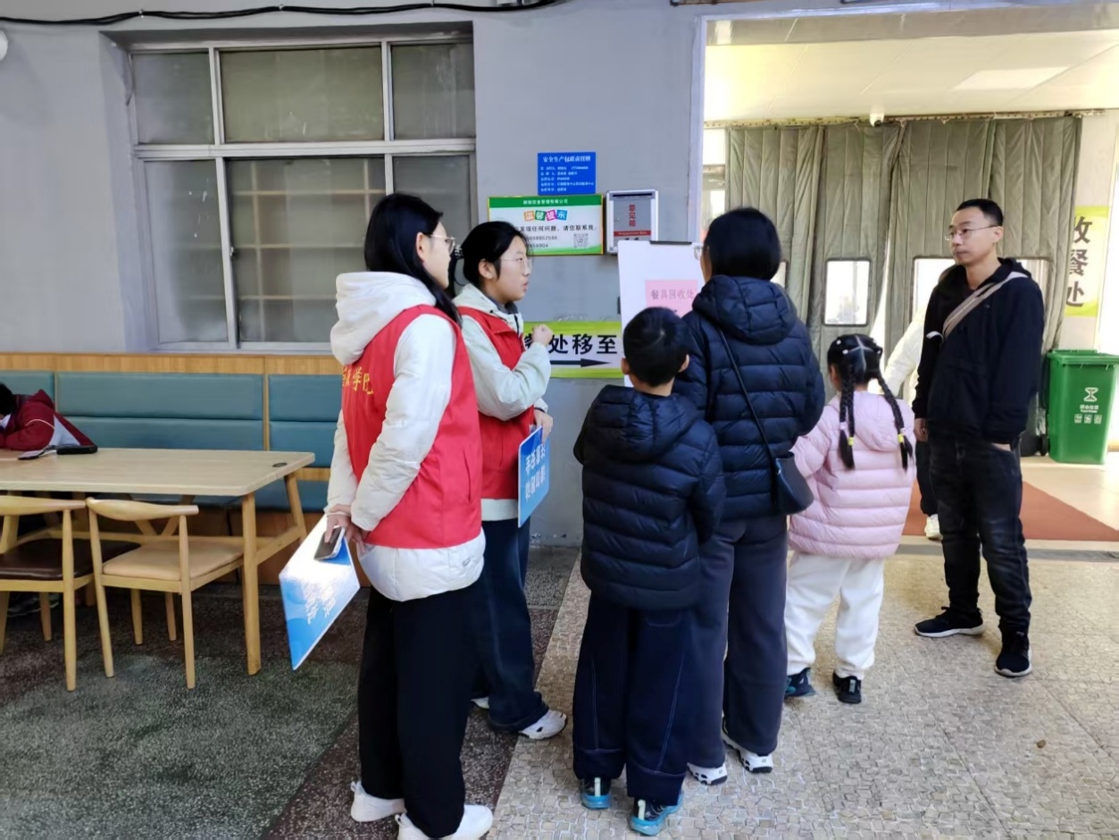 我院志愿服务运行秩序井然,在食堂入口处,志愿者引导人流有序进入,避免拥堵;针对不熟悉食堂布局的校外访客,主动介绍菜品区域、支付方式及取餐流程;就餐高峰时段,在取餐窗口、收银台旁协助维持排队秩序,提醒大家保持安全距离;对行动不便的老人、携带儿童的访客,及时协助寻找座位、端送餐食;遇到餐食打翻等情况,第一时间联系食堂工作人员清理,减少对其他就餐者的影响。