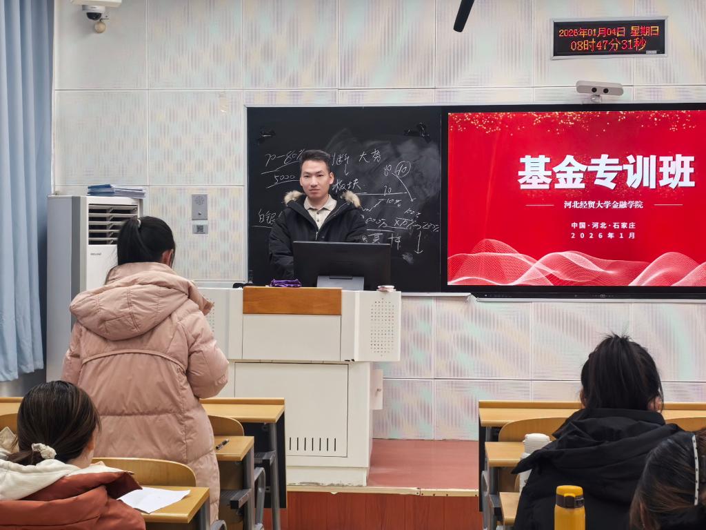 2026年1月3日,河北经贸大学证券期货实训班正式开班。永安期货股份有限公司石家庄分公司总经理王吉元、长城证券股份有限公司石家庄红旗大街证券营业部总经理助理闫红亮、河北岭石网络科技有限公司董事长邢本广、星月泓华私募基金总经理邢文豪、金融学院教师徐临、李吉栋、田懋及实训班学员参加开班仪式,金融学院副院长窦丽琛出席并致辞。