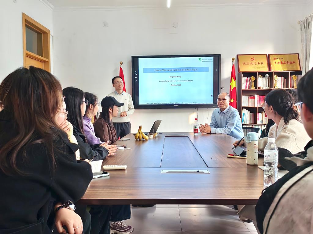 2025年10月31日,金融学院研究生在第三办公楼党务会议室成功举办第六十三期融道论坛。本期论坛以“英文论文写作与发表经验分享”为主题,由金融学院副院长范庆祝主持,特邀瑞士圣加仑大学金融学院博士研究生宁定宸担任主讲人,二十余名研究生参与交流。