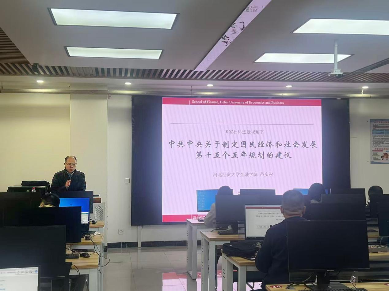 为精准把握国家中长期发展战略方向,切实提升我院教师国家社科基金等高级别课题的申报质量与立项率,近日,金融学院成功举办了“2026年国家课题申报辅导(第四期)”活动。本期辅导会由金融学院副院长范庆祝作“国家社科选题视角下《中共中央关于制定国民经济和社会发展第十五个五年规划的建议》(以下简称《建议》)”专题报告,深度解读《建议》的核心要义与选题导向,学院领导班子及全体教师参加了本次学习交流。